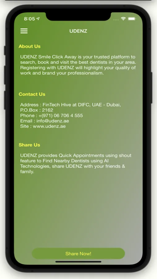 Users can search for Dentist by Distance , Type of Dental Service, Dental Specialty , Gender of Dentist , Country , City. Users can book Dental Appointments , check all Dental Offers , Submit their Smiles , Rate and share their Dental Experience. All only via the Menu and Map options on UDENZ App.