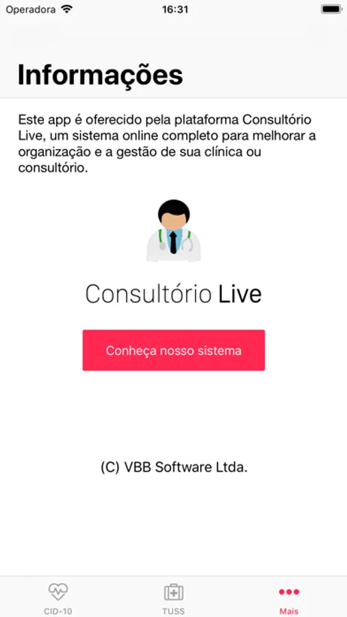 Este aplicativo é gratuito, oferecido pela plataforma Consultório Live, da VBB Software.