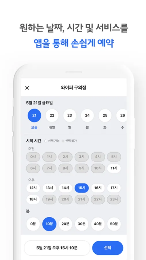 와이퍼 앱을 통한 비대면으로 날짜, 시간대 및 세차 서비스를 손쉽게 예약하세요