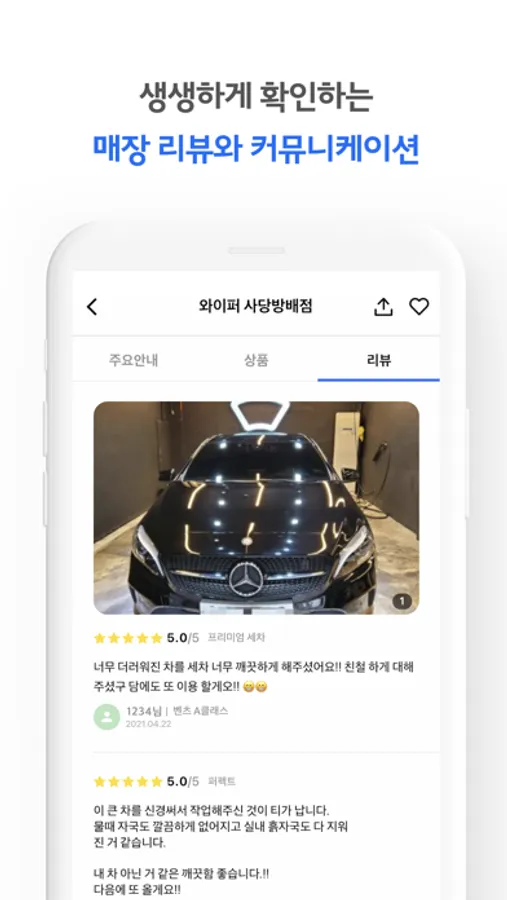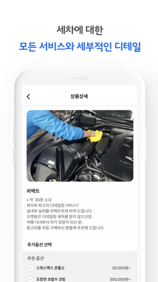 - 각 매장별 세차 상품과 디테일한 옵션 설정까지 와이퍼 앱을 통해 설정 할 수 있습니다.