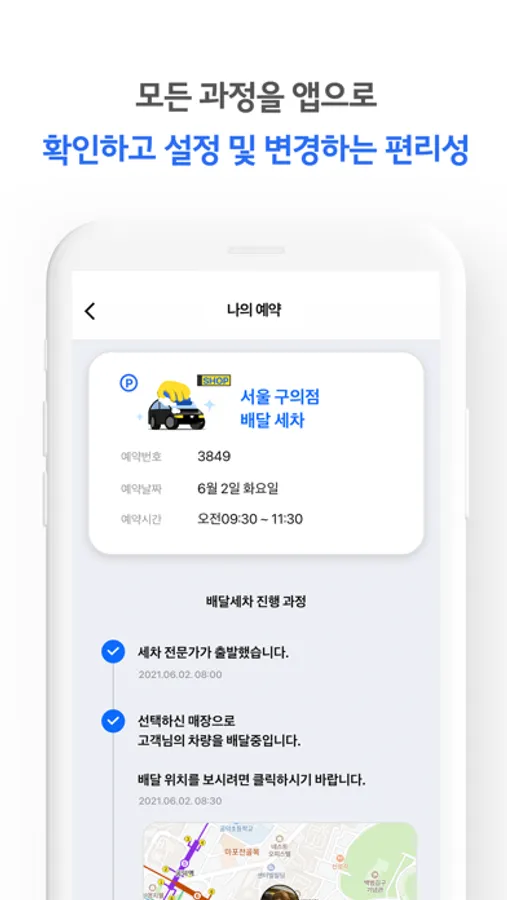 - 신청 후 전문 세차원의 원스톱 서비스 (수거→ 디테일한 손 세차→배달)가 진행 됩니다.