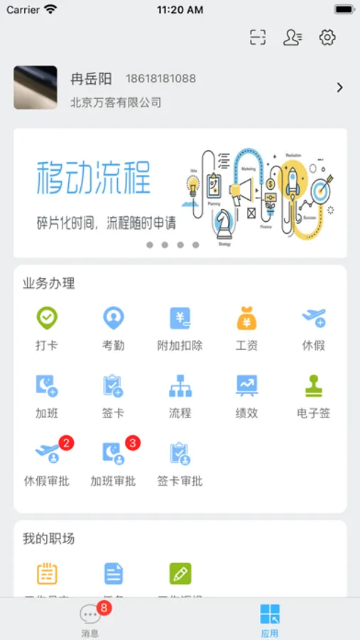 4.审批:休假、加班、签卡的流程全部电子化、实现无纸化,通过移动审批进一步提高内部效率。
