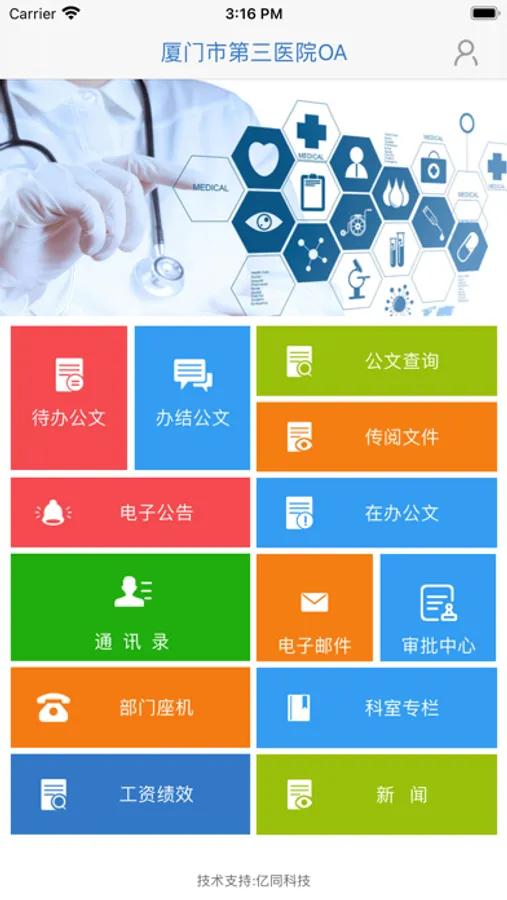 厦门市第三医院移动OA是福建亿同世纪软件科技股份公司开发的办公系统移动版,亿同OA是国内知名的协同办公软件产品。移动版提供了流程审批、公文处理、邮件、专栏、电子公告、内部邮箱等功能模块。其中流程审批作为移动版的主要功能之一,能借助移动互联网技术,极大的拓展办公空间、提高办公效率、节省办公成本。