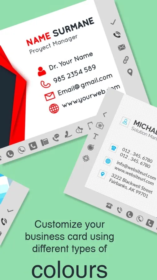 1) Different types of icons:- Easily get focus on your business contact number, email, Company address and your company URL using different types of icons, and double tap on screen to HIDE menu
