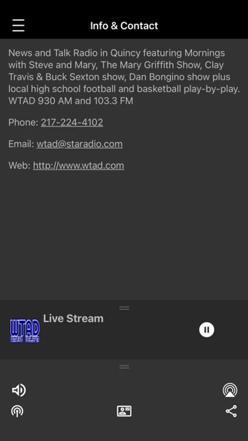 News and Talk Radio in Quincy featuring Mornings with Steve and Mary, The Mary Griffith Show, Clay Travis & Buck Sexton show, Dan Bongino show plus local high school football and basketball play-by-play. WTAD 930 AM and 103.3 FM