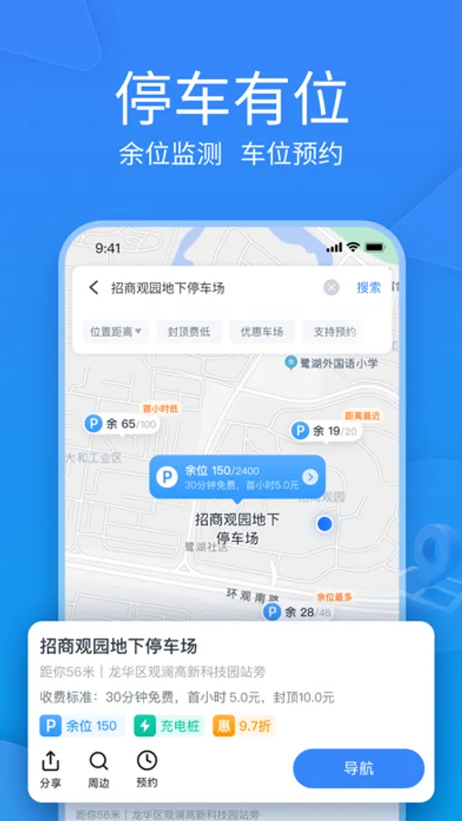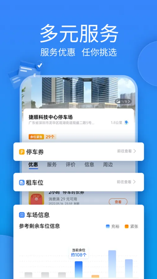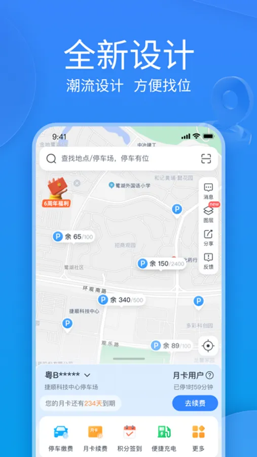 捷停车致力于让停车更便捷。车主可在捷停车APP上快速精准查找车场车位信息、优惠信息,使用找车位、找优惠、预约/预订车位、租车位等便捷服务;同时,捷停车还提供线上缴费、无感支付、电子发票、月卡续费、积分签到等基础服务,以及加油、充电、车主商城、会员尊享等增值服务,让车主真正停车有位有优惠。