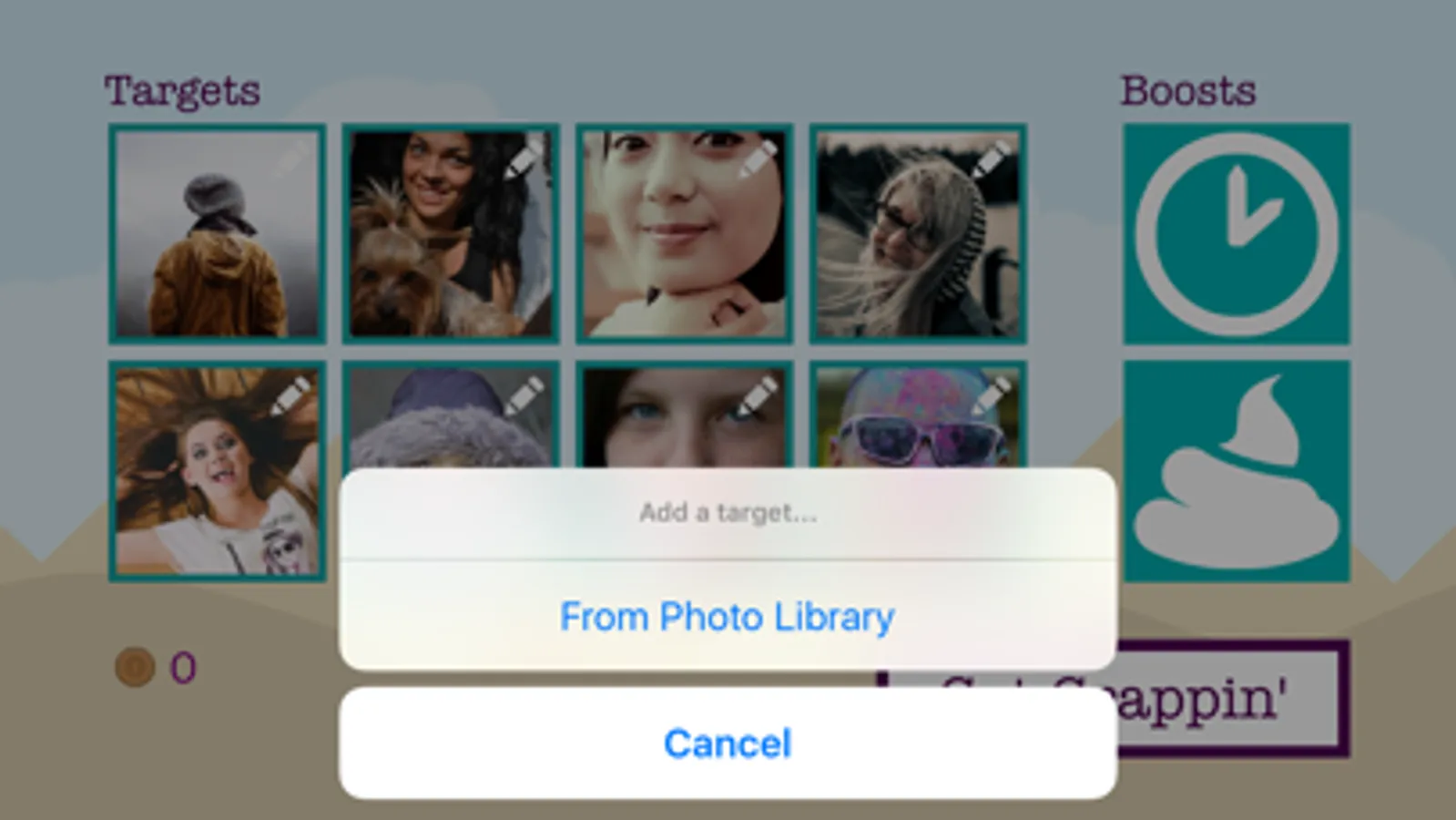 When you go to start a new game it will load the profile pictures of 8 random Facebook friends who have authorised the Crappy Birds! app, you can then choose to continue or click on a target to add from the photo library or take a picture.