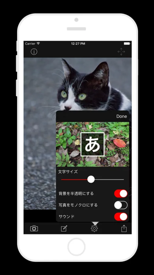 文字サイズ、文字の背景(黒、透過)、写真のカラー・モノクロを変更することができます