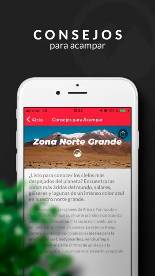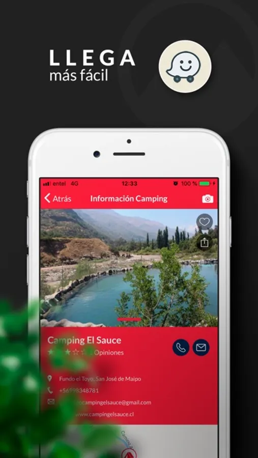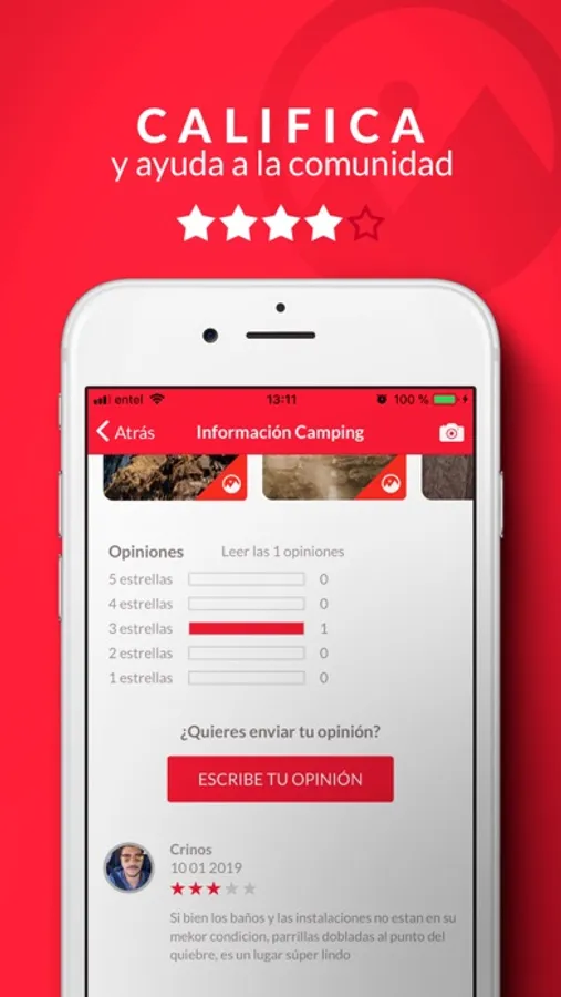 En esta app podrás encontrar a través de geolocalización los camping más cercanos a tu ubicación, podrás revisar si son bien evaluados por otros usuarios y podrás evaluarlos tú. También, si estás en un camping que no se encuentra en nuestra app, podrás cargarlo y recomendarlo.