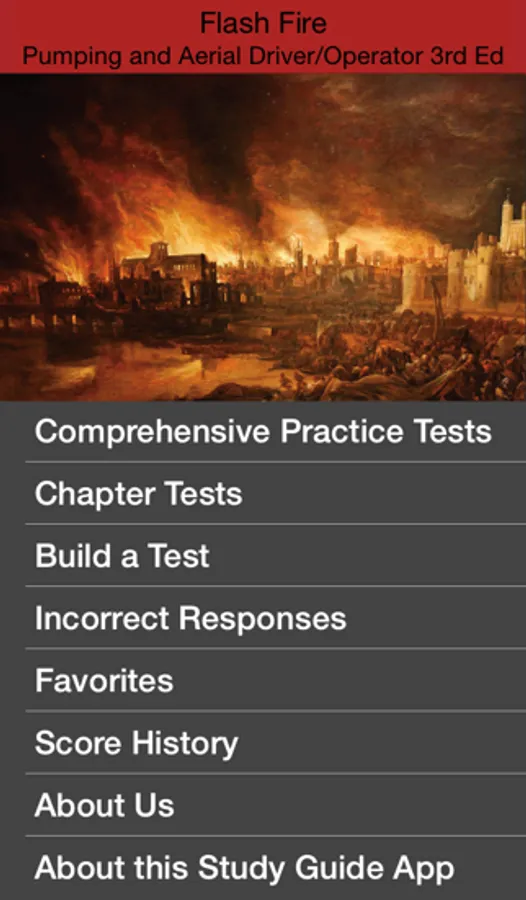 Flash Fire will help fire service personnel prepare for written examinations based on IFSTA Pumping and Aerial Apparatus Driver/Operator Handbook, 3rd Edition. This study guide app includes a test bank with over 1100 multiple-choice questions based on the IFSTA textbook. Each question is page-referenced to the text.