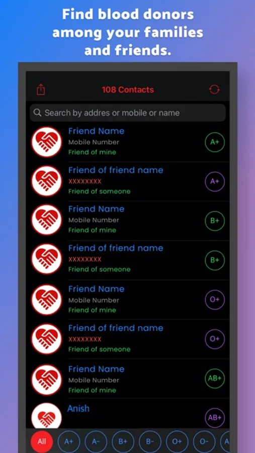 • Find blood donors from your phone's contact list.