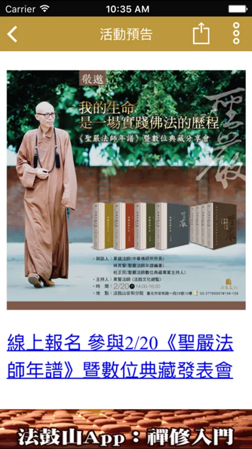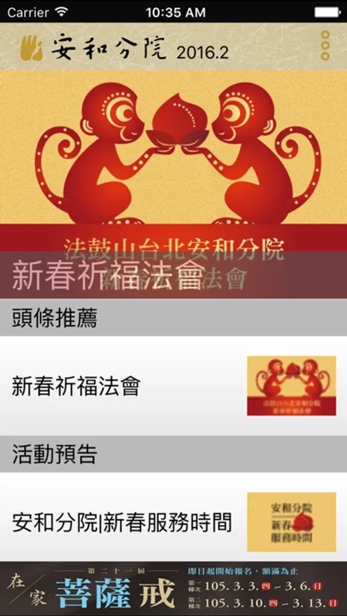 位在台北市東區的安和分院,成立於1994年9月10日,用以接引市區居民認識法鼓山、親近佛法。 1994年9月10日,安和分院舉行佛像開光大典, 典禮中聖嚴法師以硃砂筆象徵性地為大殿前供奉的五尊佛像點睛開光, 五佛像包括東方阿閦佛、南方寶生佛、西方阿彌陀佛、 北方不空成就佛以及中央的大日如來佛, 為弘化工作開啟首頁。 安和分院位處市區中心,在舉辦各種佛法弘化與禪修禪藝等課程後, 現今為在都市之中一處難得的清淨道場。 目前主要舉辦活動,如 : 禪修指引、初級禪修班、禪一, 念佛、佛一暨八關戒齋、地藏法會、大悲懺法會、 藥師法會、菩薩戒誦戒會, 以及佛學課程、禪藝推廣教室等。 地址: 台北市大安區安和路一段29號10樓 (捷運忠孝敦化站5號出口-設有電扶梯) 電話: 02-2778-5007~9轉156~159 服務時間: 週一~週五 09:00~21:00 週六~週日 09:00~17:00