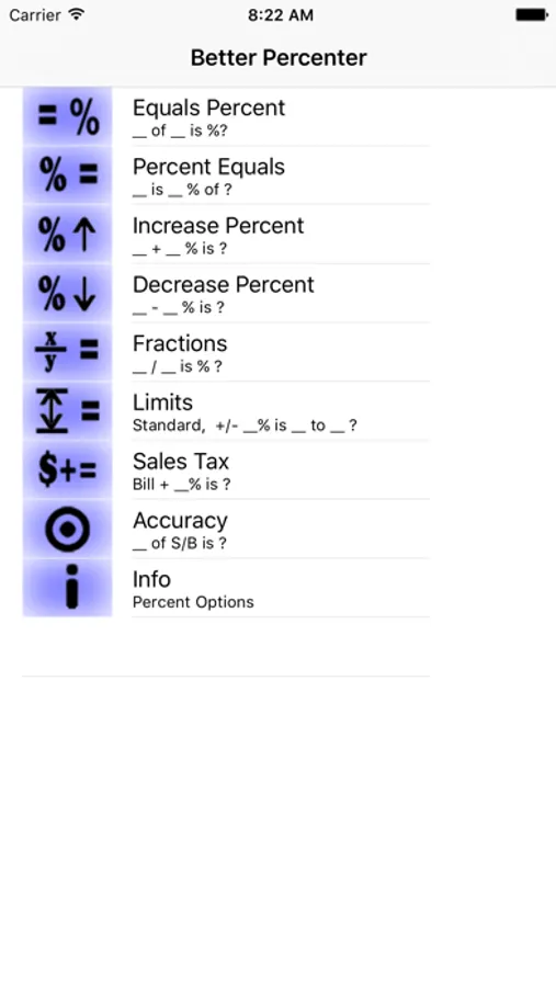 Better Percenter makes confusing and complicated percentage calculations easy! Includes eight different percentage calculations: Equals Percent, Percent Equals, Increase Percent, Decrease Percent, Fractions, Limits, Sales Tax and Accuracy. Better Percenter is designed to be easy to use with adjustable resolution and an info page with descriptions and examples making percentage calculations a breeze for those of us who are "math challenged". Enjoy!