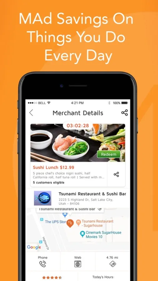 Save money with the best deal finder app for local restaurants! The MAd Reach™ app is the deal finder that uses geolocation to send exclusive coupons and time-sensitive deals based on your location! Lunch is served and it’s a deal!