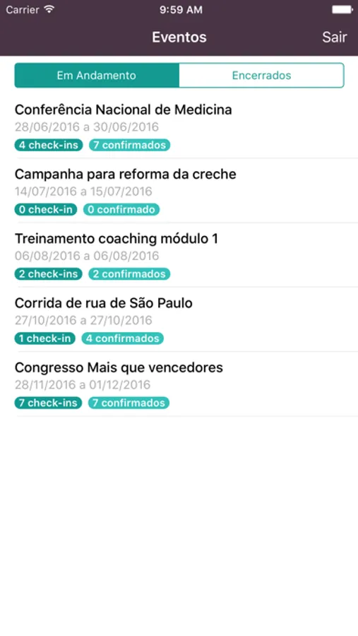 Além disso, você pode acompanhar a quantidade de inscritos confirmados e também dos que já fizeram check-in de cada um dos seus eventos.