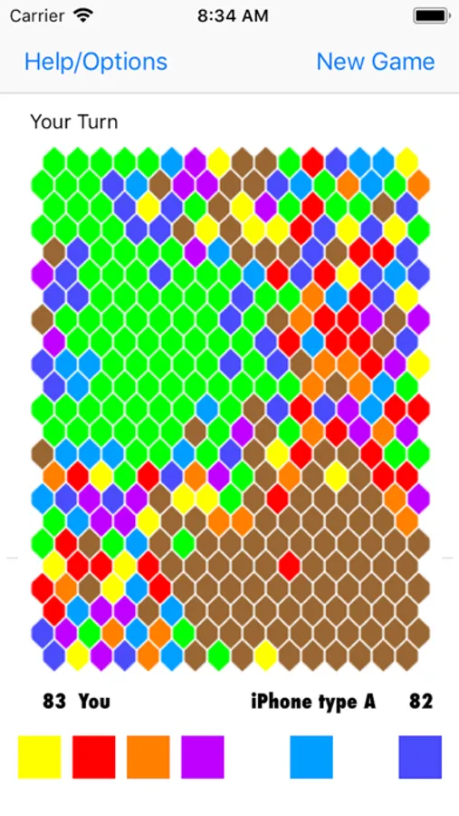 Select a color to capture hexagons of that color adjoining the hexagons you have already captured. Block your opponent with strategic moves. Capture more hexagons than the iPhone/iPad to win. Each game is short so you can play when you have a few minutes to spare. Statistics shows your record over time.