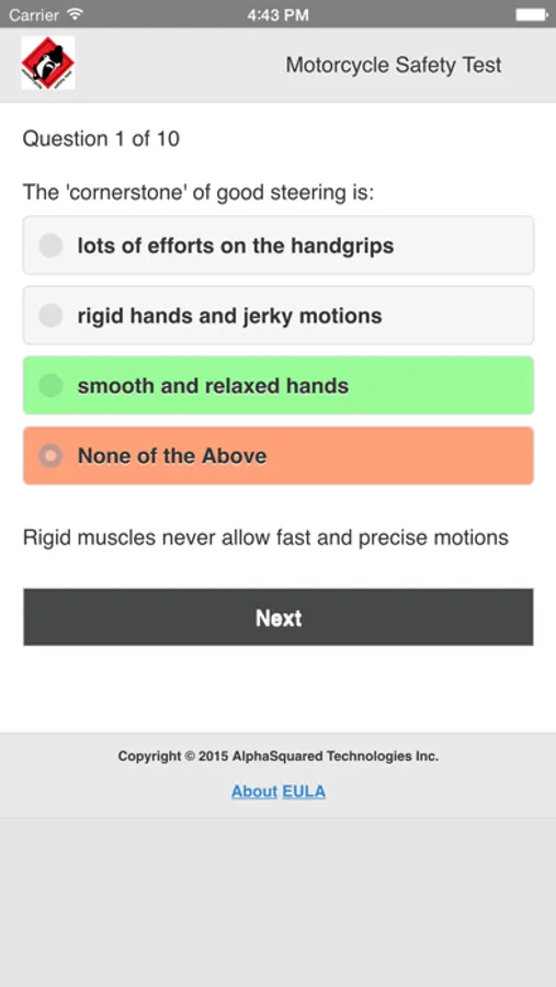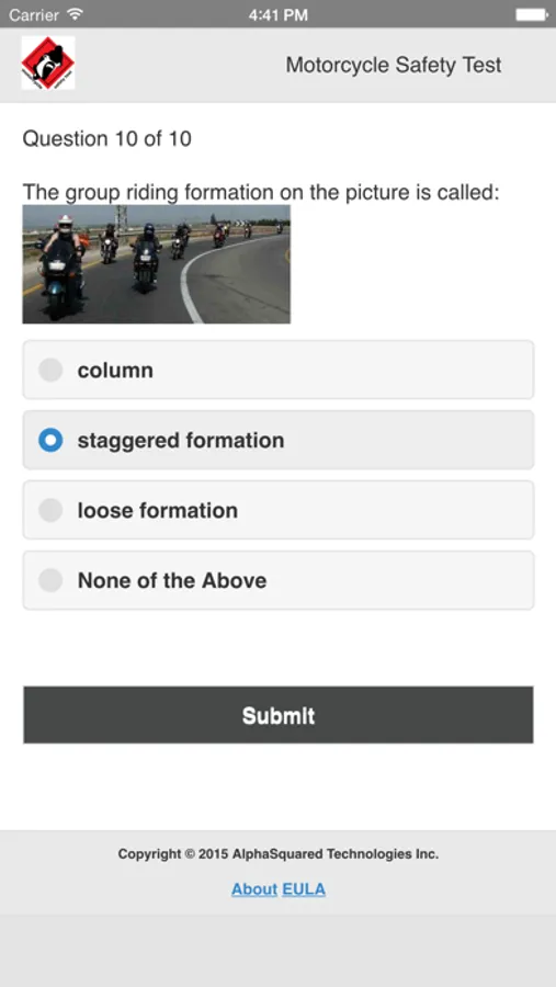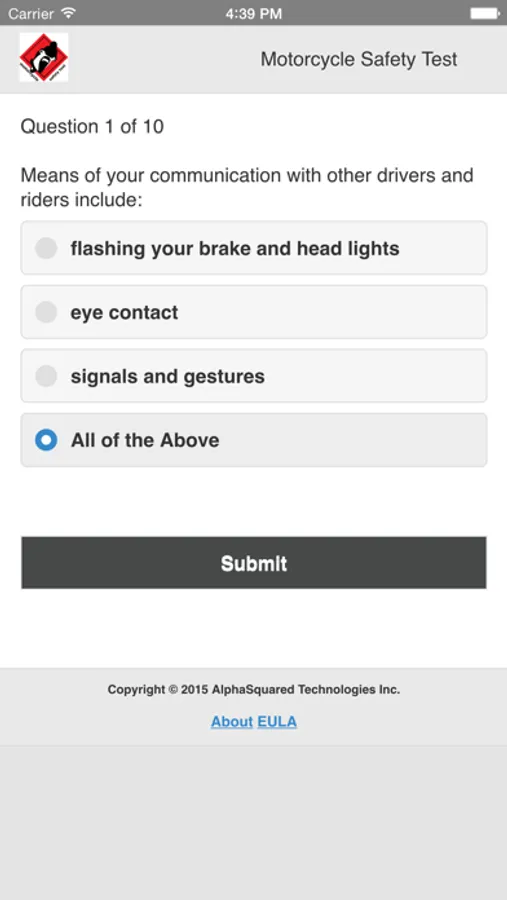 At AlphaSquared Technologies Inc. we strongly believe that everyone can and should ride motorcycle safely. In our development team we are all motorcycle riders. That is why we have created this challenge test application to help all newbies and even seasoned riders to feel more confident on the road.