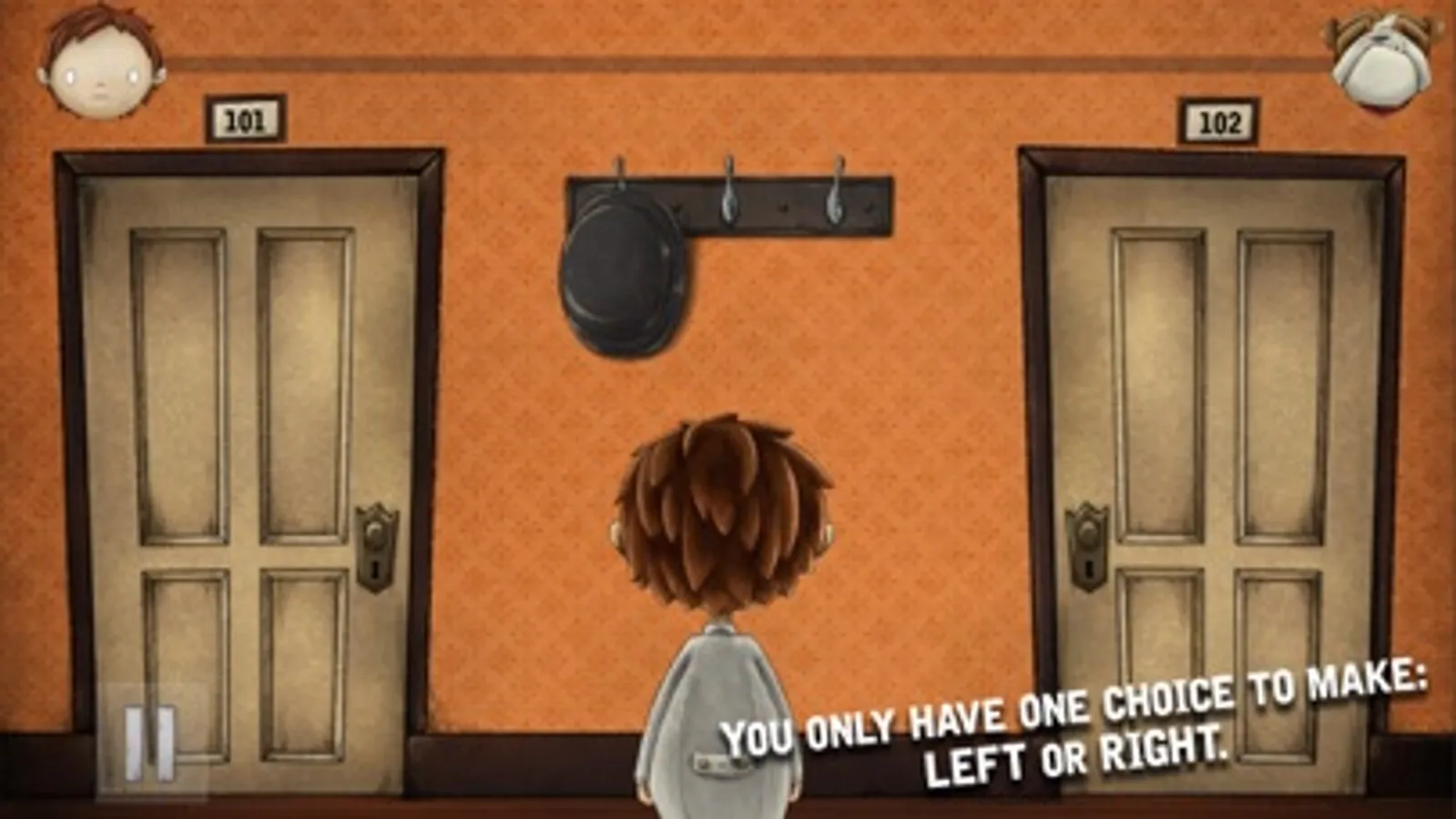 Left-Right: The Mansion is a little game about a boy, Billy, whose dog named Gigi ran away inside a big mansion. He must journey through this mysterious place, where he will have to find and remember the right path in order to find her. Every room will challenge him with a simple choice to make: left or right. Two doors, yet only one will make him go forward; the other one will bring him back to the beginning.
