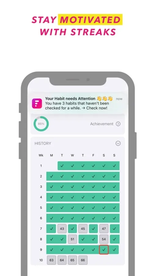 Each habit has a 66-day challenge to encourage you to stick to your goal. The day grid will be your best tool to track, check, and reflect on your progress. You can just keep going beyond 66 days. The app does track any habit for as long as you need to.