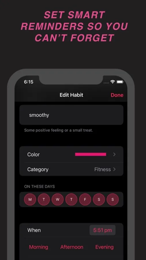 You can customize your habits. Give your habit a name, choose a color, set a recurring reminder and choose the days you want to exercise the habit. The app makes it easy to create a list of practices customized for you.