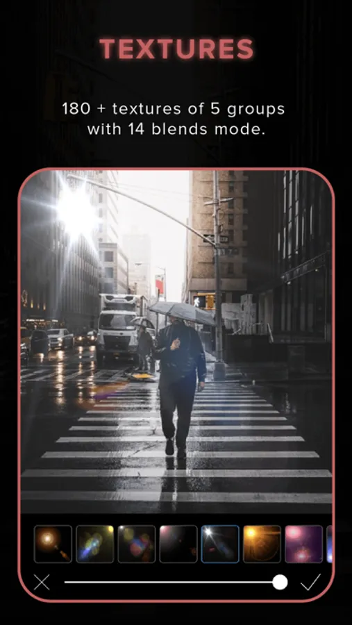- 128 light texture of 7 groups (Original, lens flare, light leak, dot, grunge, snow, rain). 16 blend modes to fine tune.
