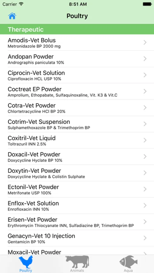 - Products covering all major therapeutic classes comprising of antibacterial agents, anthelmintics, NSAIDs, antidiarrheals, vitamins & mineral supplements, digestive stimulants etc.