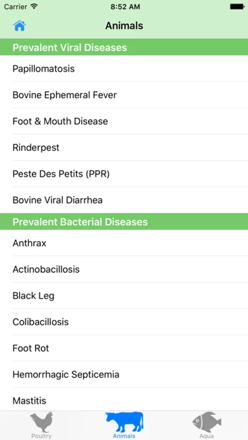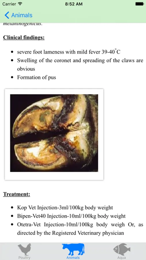 - Disease details with causal agent, clinical signs, PM Lesions, treatment.