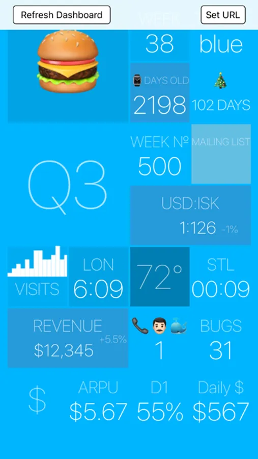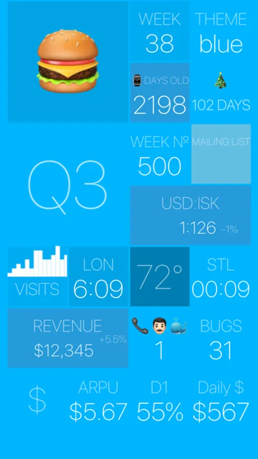 The JSON is updated and managed by you. We'll do the rest to render it nicely onto your device. You can change the text, values, box type and colors for each value.
