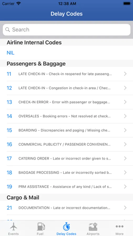 A list of the IATA and airline specific delay codes is provided with a very convenient search feature.