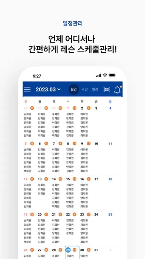 1:1레슨관리, PT회원관리, 그룹수업관리를 위한 스케줄 예약 회원관리 어플입니다.