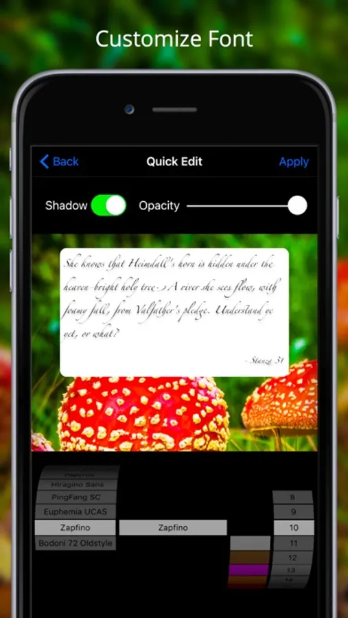Packed with all sorts of extra content like: Tons of beautiful images to choose from or use your own, a quick editor to change the look of the app and an editing suite that lets you fully customize the look of your quotes.