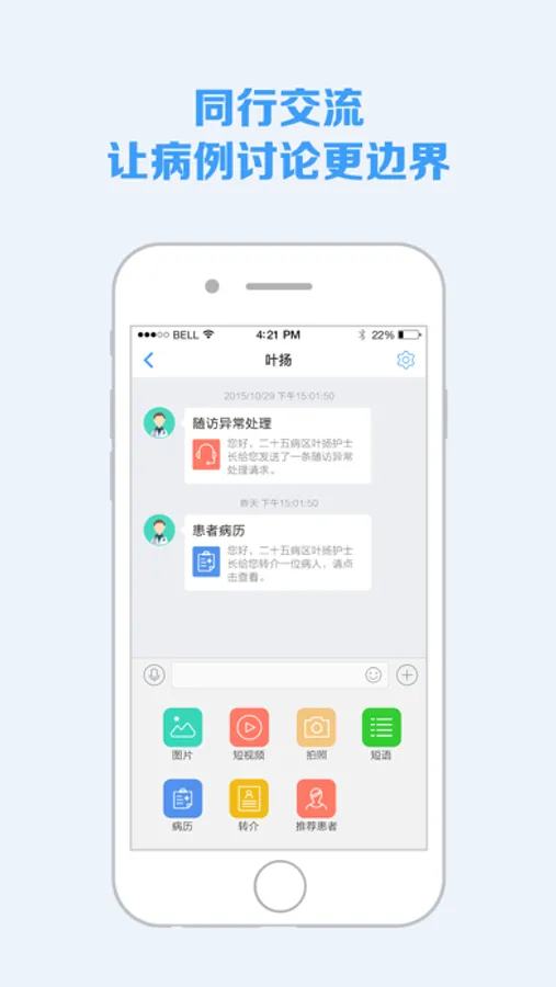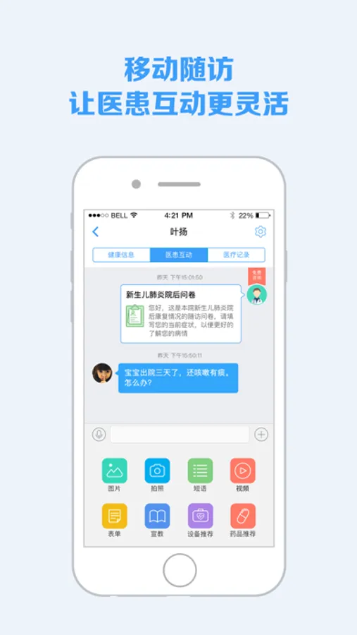 -----消息互动:以文字、图片、视频、短语、患者转介、患者病历、随访异常处理提醒等多种方式,便捷的实现与患者之间的消息互动、与同行之间的病例讨论,从而实现院后患者服务的连贯性和可信性。
