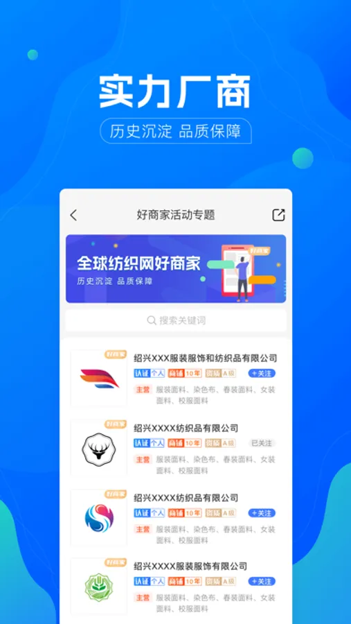 全球纺织网APP由全球纺织网官方(www.tnc.com.cn)开发,基于全球纺织网16年纺织行业积淀,并实现数据同步共享。供应商可以快捷开设、打理网上商铺,随时随地管理客户订单;采购商能够便捷查找和浏览纺织产品,高效发布采购需求。每天都有纺织资讯新闻,让您及时掌握最新动态。