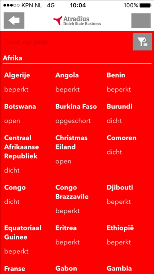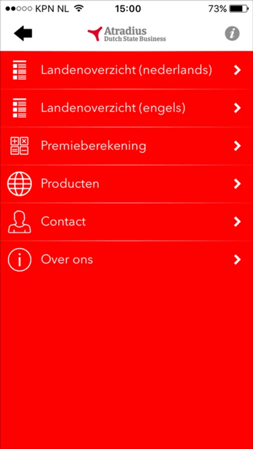 Met deze app kunt u nagaan of de betalingsrisico's van uw exporttransactie door Atradius Dutch State Business verzekerd kunnen worden. Zoek in het landenoverzicht het land met behulp van het filter of de zoekfunctie en zie wat het dekkingsbeleid is en of er ruimte beschikbaar is. Ook kunt u eenvoudig gebruik maken van de premieberekening (link naar de website).