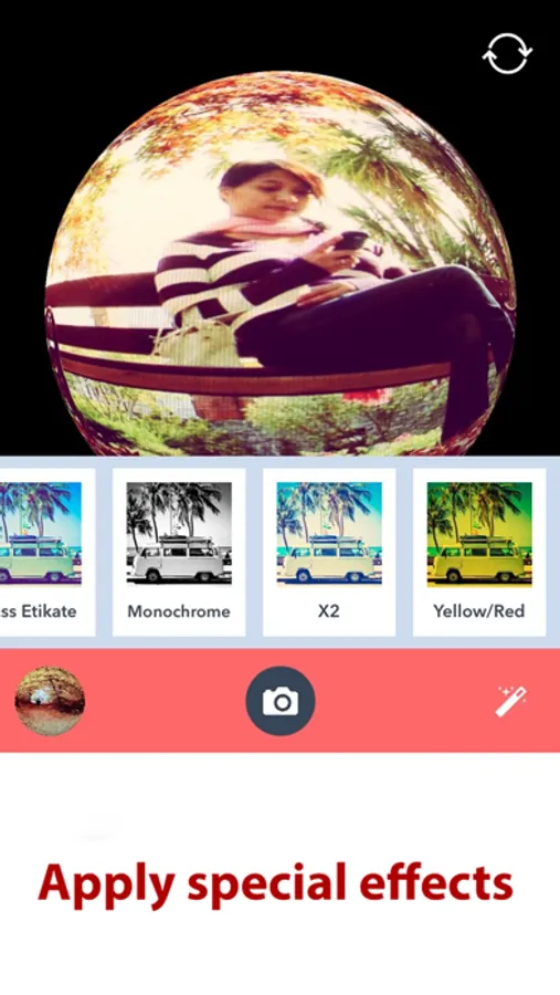 Add filters to your photos: apart from the fisheye effect, the app also has eight real-time photo filters to give you even more creative results. The filters work in real-time, so you can see the effects applied while you are taking pictures.