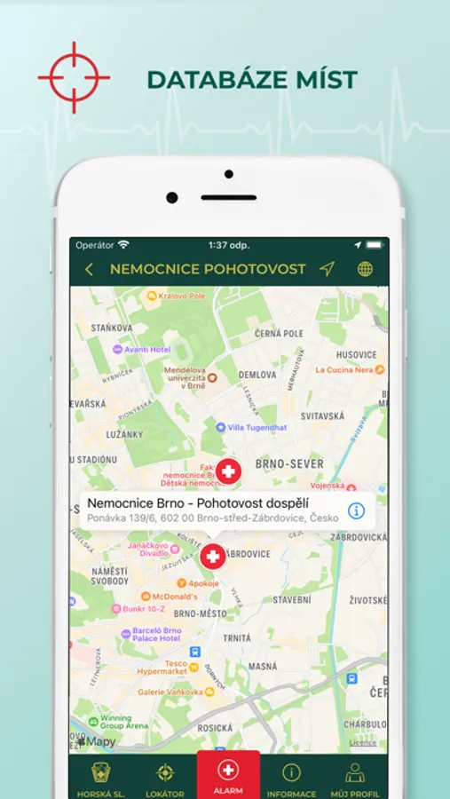 S funkcí “Lokátor” jednoduše zjistíte svoji přesnou GPS polohu a najdete nejbližší automatizovaný externí defibrilátor /AED/, lékařskou, zubní, či lékárenskou pohotovost. Aplikace přehledně zobrazuje body zájmu s možností rychlé navigace na dané místo.