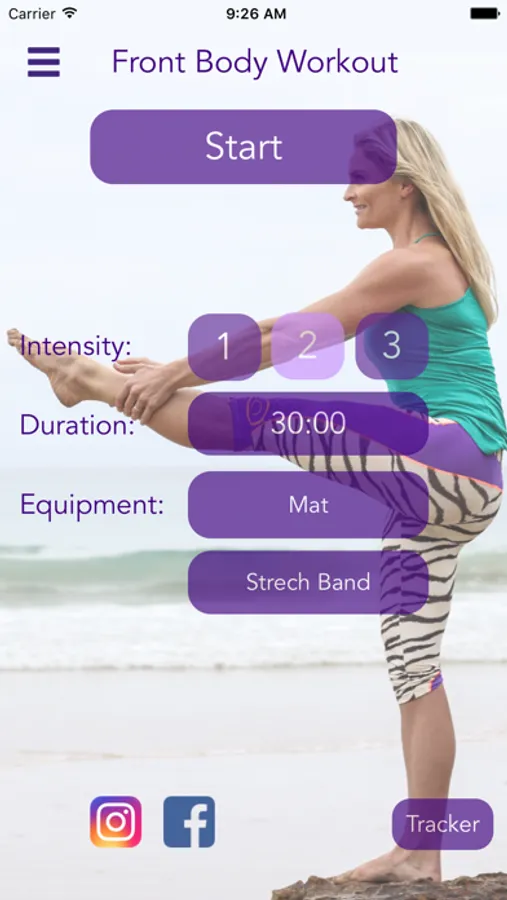 WORKOUTS consist of individual exercises, combined in a way to ensure a natural flow from one to another, to assure a balanced weekly exercise routine with best results. We recommend 3 workouts per week on non-consecutive days (For example Monday – Back Body, Wednesday – Front Body, Friday – Full Body). Workouts are structured in circuits where you complete one set of a combination of exercises/stretches, then repeat the circuit one to three more times, depending on your selected intensity level. There are 3 intensity levels to choose from before starting a workout, depending on your fitness level – 1: Easy (20 minutes), 2: Moderate (30 minutes) and 3: Hard (40 minutes).