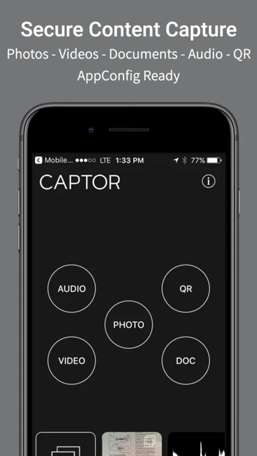 CAPTOR™ enables the secure capture and control of sensitive business-related content (photos, videos, audio, and scanned documents) on iPhones and iPads. CAPTOR combines the productivity functions of a camera app, document scanning app, audio/video recording app photo/document annotator, and QR-Code reader.