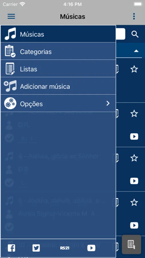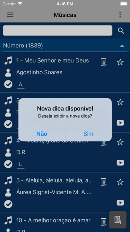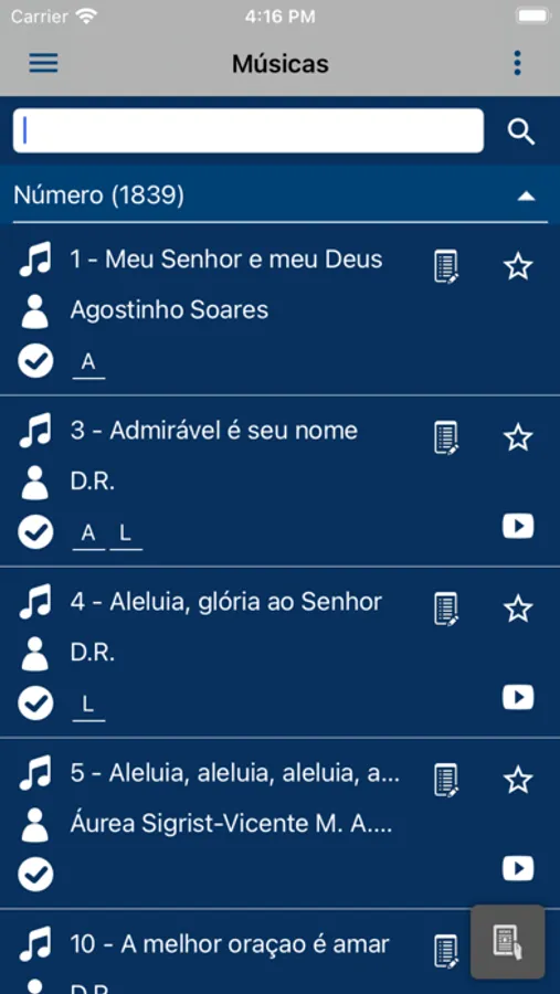 As músicas podem ser encontradas por título, nome do artista, numeração do livro ou por alguma expressão ou frase que está dentro da música.