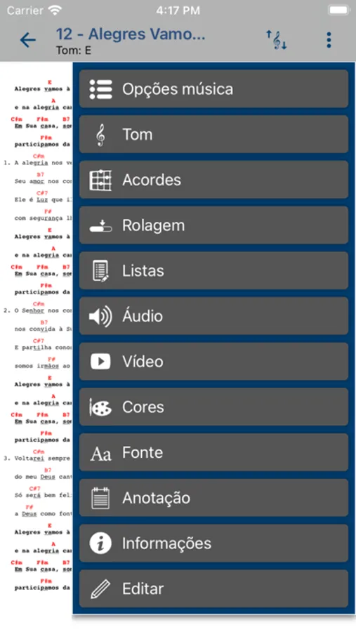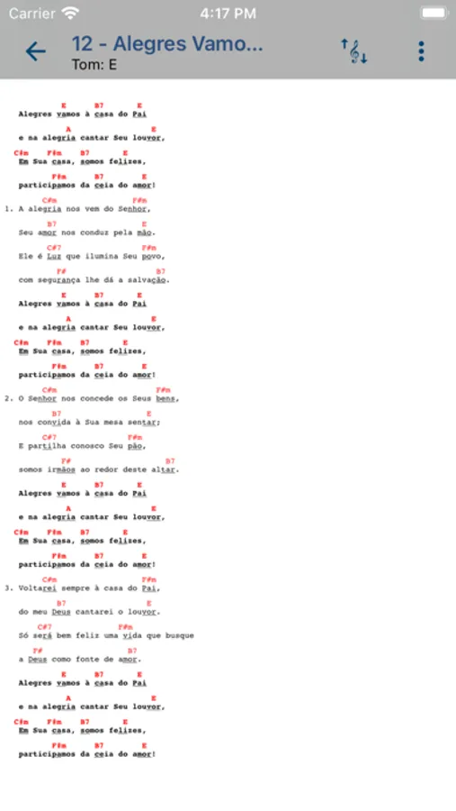 No aplicativo estão presentes todas as músicas do livro de cânticos “Louvemos o Senhor 2015”, inclusive as músicas de anos anteriores que foram retiradas dos livros impressos. A cada ano, a lista de músicas é atualizada.