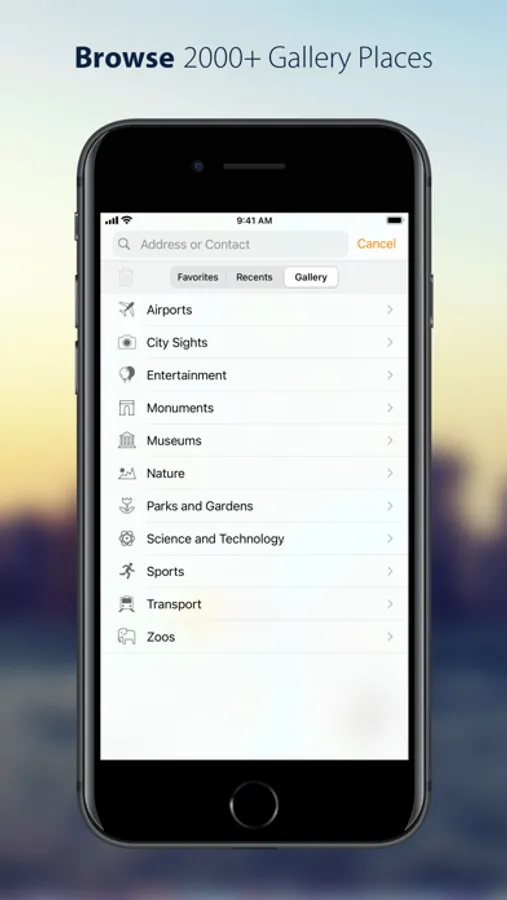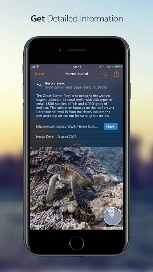 More than 2000 hand-picked “Gallery Places” show spectacular places such as museums, castles, national parks, ski slopes and even underwater attractions. Geysers in Yellowstone national park, old masterpieces in Amsterdam’s van Gogh museum or NASA’s rocket launch pad in Cape Kennedy are just a few of the breathtaking places waiting to be explored. Gallery places also include background information such as descriptions and links.