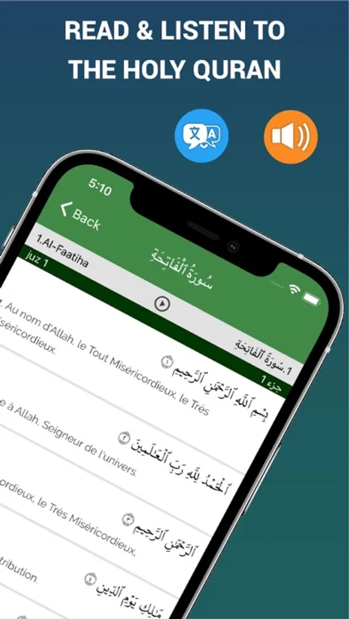 Read the Holy Quran and enjoy multiple free features like color theme, Quran translation, bookmark, font size management and more options.