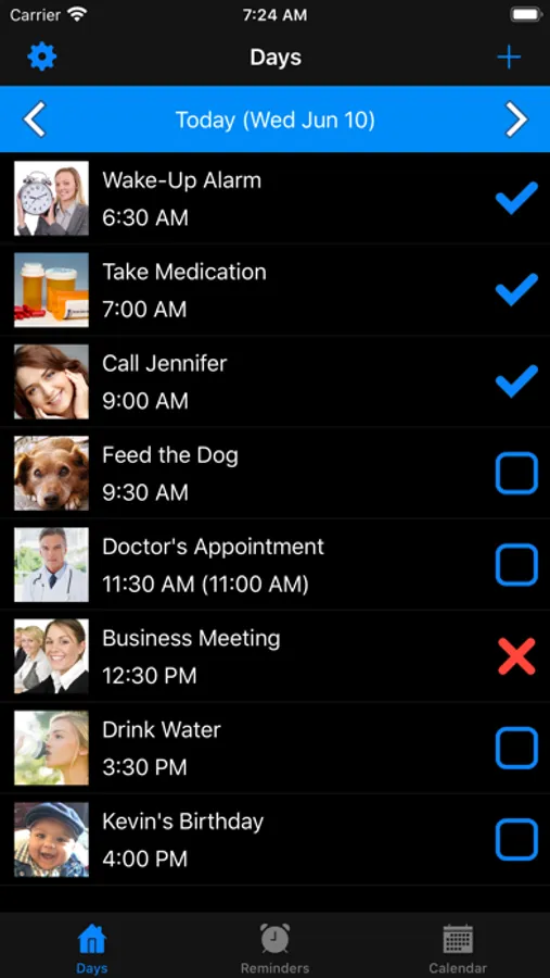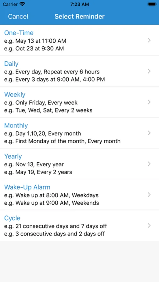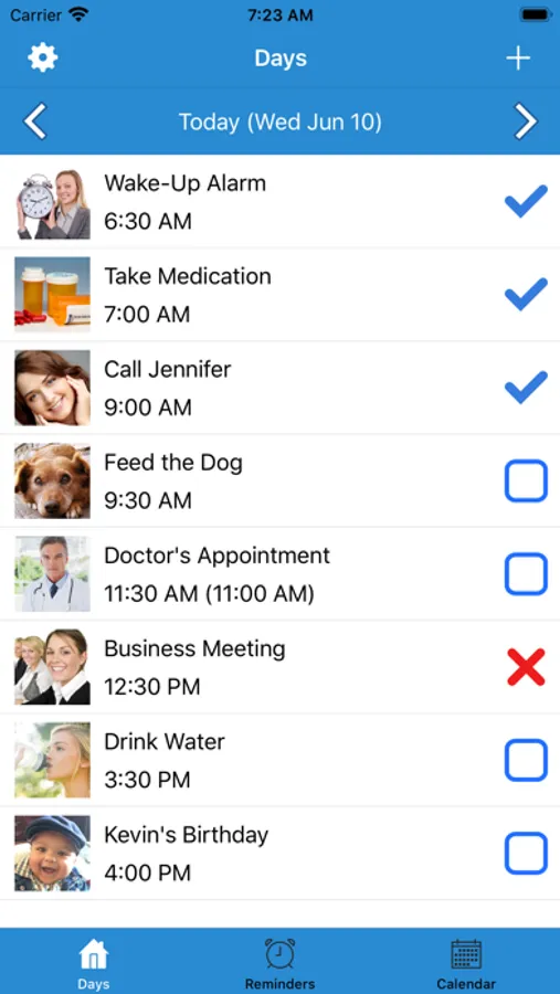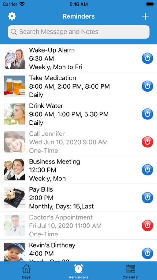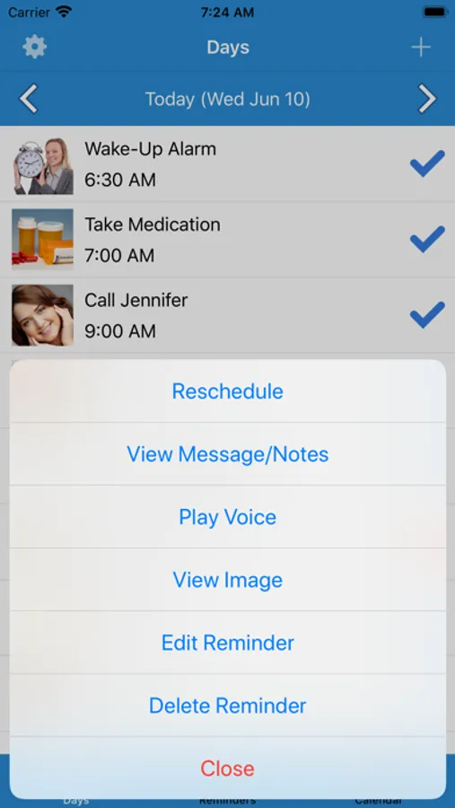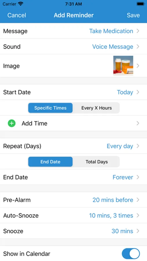 Reminders are fully configurable: Pre-Alarms, Auto-Snooze, Snooze, Reschedule, Custom Messages, Custom Sounds, Custom Images, Notes and More. Practically any type of reminder can be set: