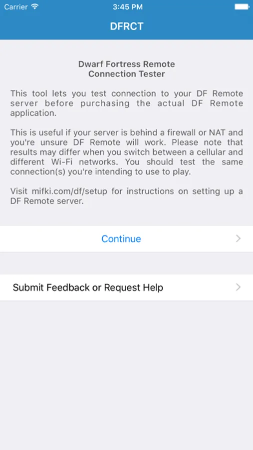 This is useful if your server is behind a firewall or NAT and you're unsure DF Remote will work. Please note that results may differ when you switch between a cellular and different Wi-Fi networks. You should test the same connection(s) you're intending to use to play.