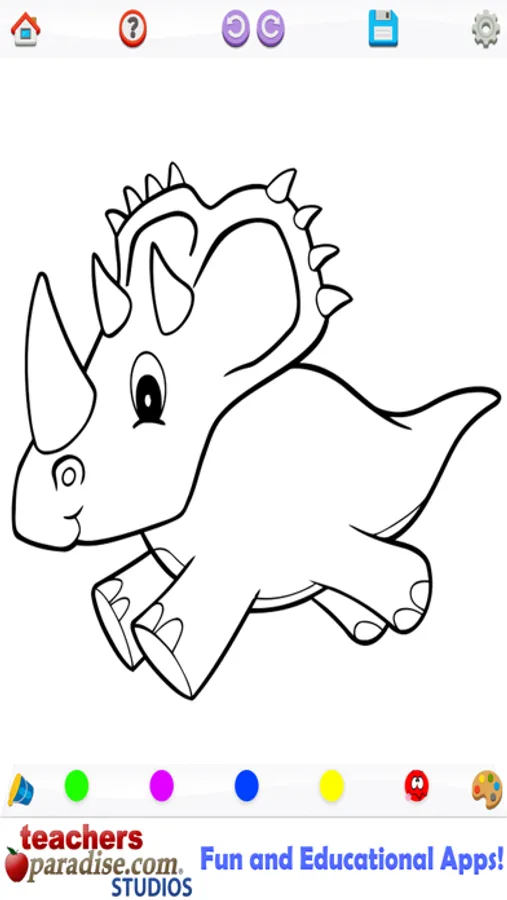 Set your child's imagination on a prehistoric journey with our Dinosaur Coloring Book. This interactive coloring book allows your child to select from a wide variety of images creating a never ending coloring book. Allow children to color their favorite dinosaurs over and over with easy to change colors allows your child to create different variations of their masterpiece. Share your child's creation or save to your device to show their adventure later.
