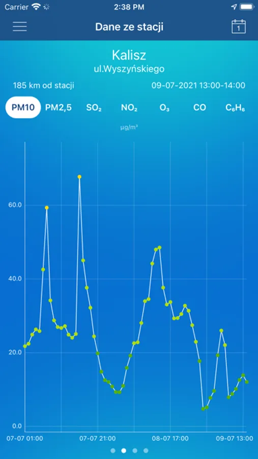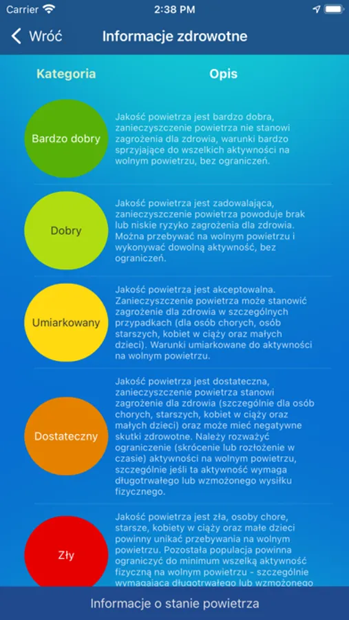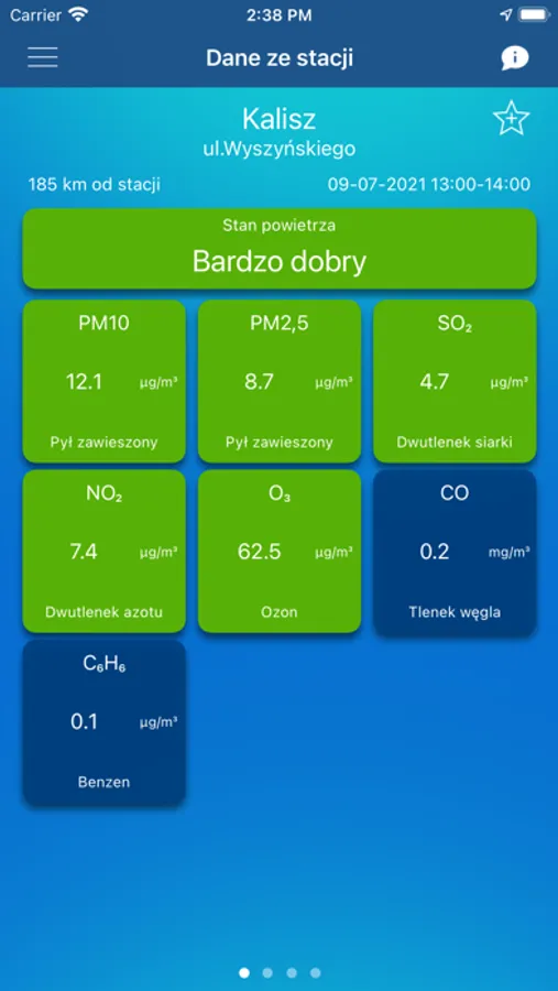 Przy dostępie do internetu i włączonych usługach lokalizacyjnych aplikacja pokazuje dane z najbliższej stacji pomiarowej lub z innych wybranych stacji.