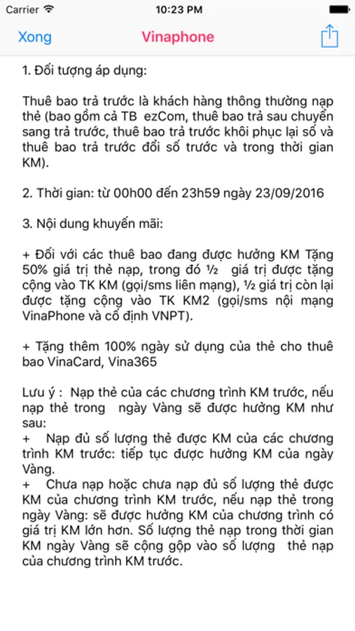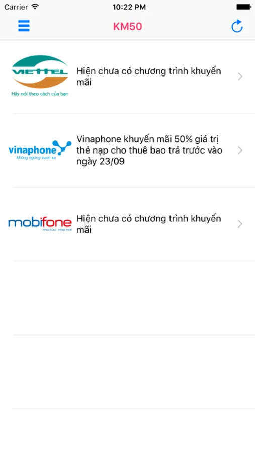 • Cung cấp thông tin về các chương trình khuyến mãi giá trị thẻ nạp của 3 nhà mạng: Vinaphone, Mobifone & Viettel.