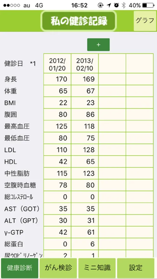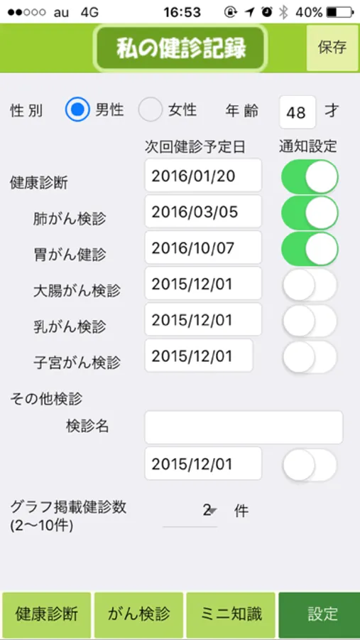 肺がん、胃がん、大腸がん、乳がん、子宮がんの5つのがん検診の記録(検診日、実施機関、結果)と、