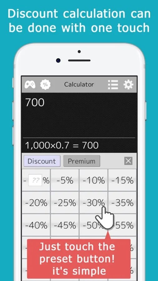 Discount calculation such as 20% and 30% discount can be done with one touch.