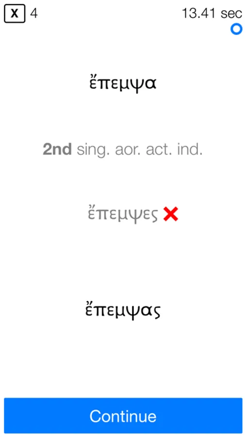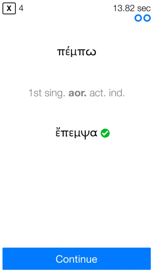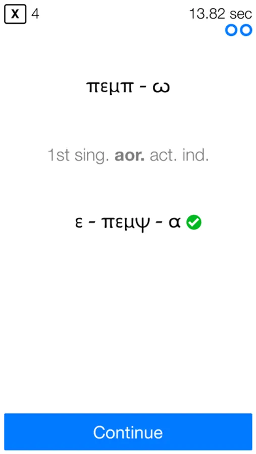 The app follows the units of the course's textbook, Hansen & Quinn's Greek: An Intensive Course. From the 114 verbs introduced in Hansen & Quinn there are over 15,800 possible verb forms, not including additional forms given in the appendix. The app presents users with one verb form and prompts them to change it to another in 30 seconds or less. Users should already have a good command of Ancient Greek verbs; the app is aimed at perfecting and reinforcing this knowledge.
